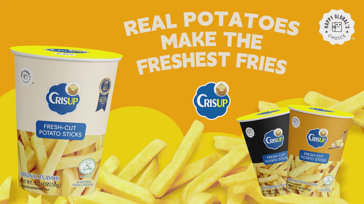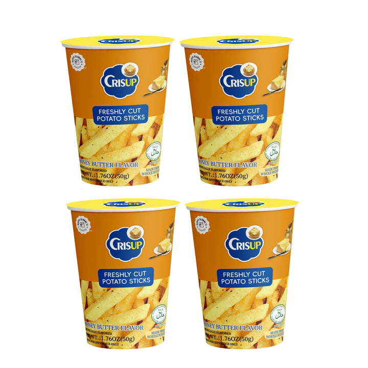 Enjoy Crisup Honey Butter Flavored Potato Sticks in a convenient pack of four 1.76 oz cups. Each cup holds 50 grams of freshly cut potato sticks, delivering a crispy texture and a unique balance of sweet and savory honey butter flavor. Individually packaged for freshness and ease, these snacks are perfectly portioned for on-the-go enjoyment without compromising crunch or taste.